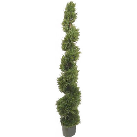 Artificial outdoor topiary will add a creative accent to the front entrance of your home or business. 6.4 foot artificial outdoor Cypress spiral topiary can be installed directly into the ground for a natural look or in a decorative planter. Our outdoor artificial topiary are infused with a UV inhibitor that is designed to protect against the sun's harmful UV rays, and they are designed to withstand average wind and rain exposure.