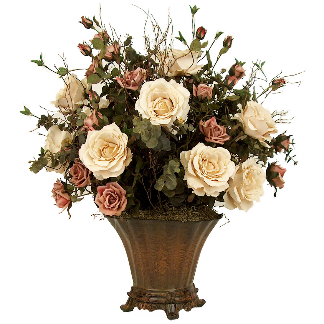 Dusty and cream roses are the focal point of this silk flower centerpiece. Roses are accented with eucalyptus and natural birch and arranged in a fluted cache vase. This arrangement is perfect for a round entry way table or as an accent in a great room.