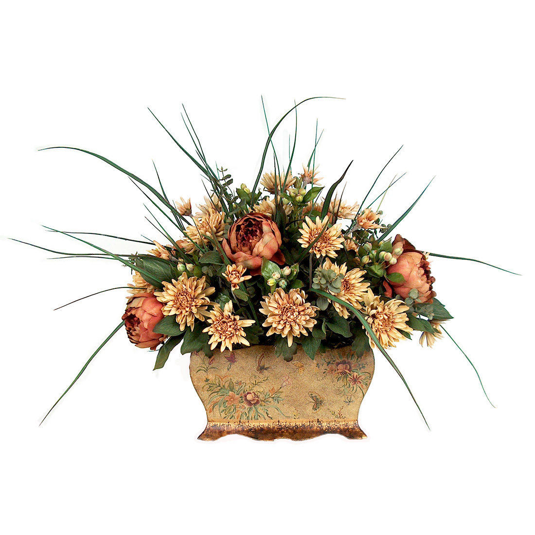 Wonderfully crafted amber colored peonies and rust colored wild chrysanthemums are the centerpiece of this silk flower arrangement. Hawthorne berries, grass and an intricately adorned floral porcelain planter are used as elegant accents in this country French decor piece. This silk floral arrangement is designed to be the centerpiece in a living room or might work well on a large entrance way table.