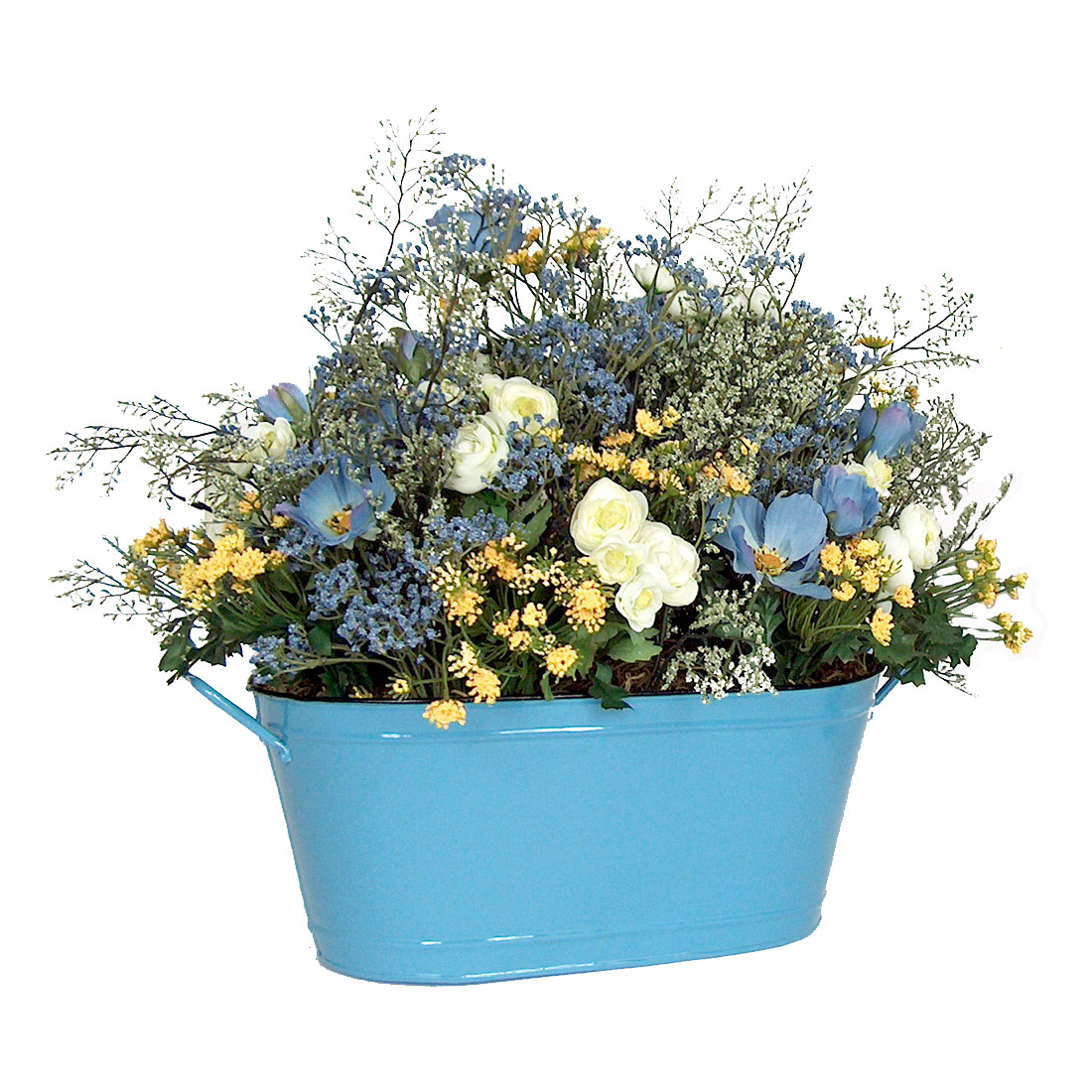 Using blue cosmos, meadow flowers and an oval galvanized enamel tub our designer brings the bright colors of nature to your home. The soft colors of this arrangement are perfect for an eat in kitchen or protected sitting porch. We only use the highest quality silk flowers and accents in our hand made arrangements.