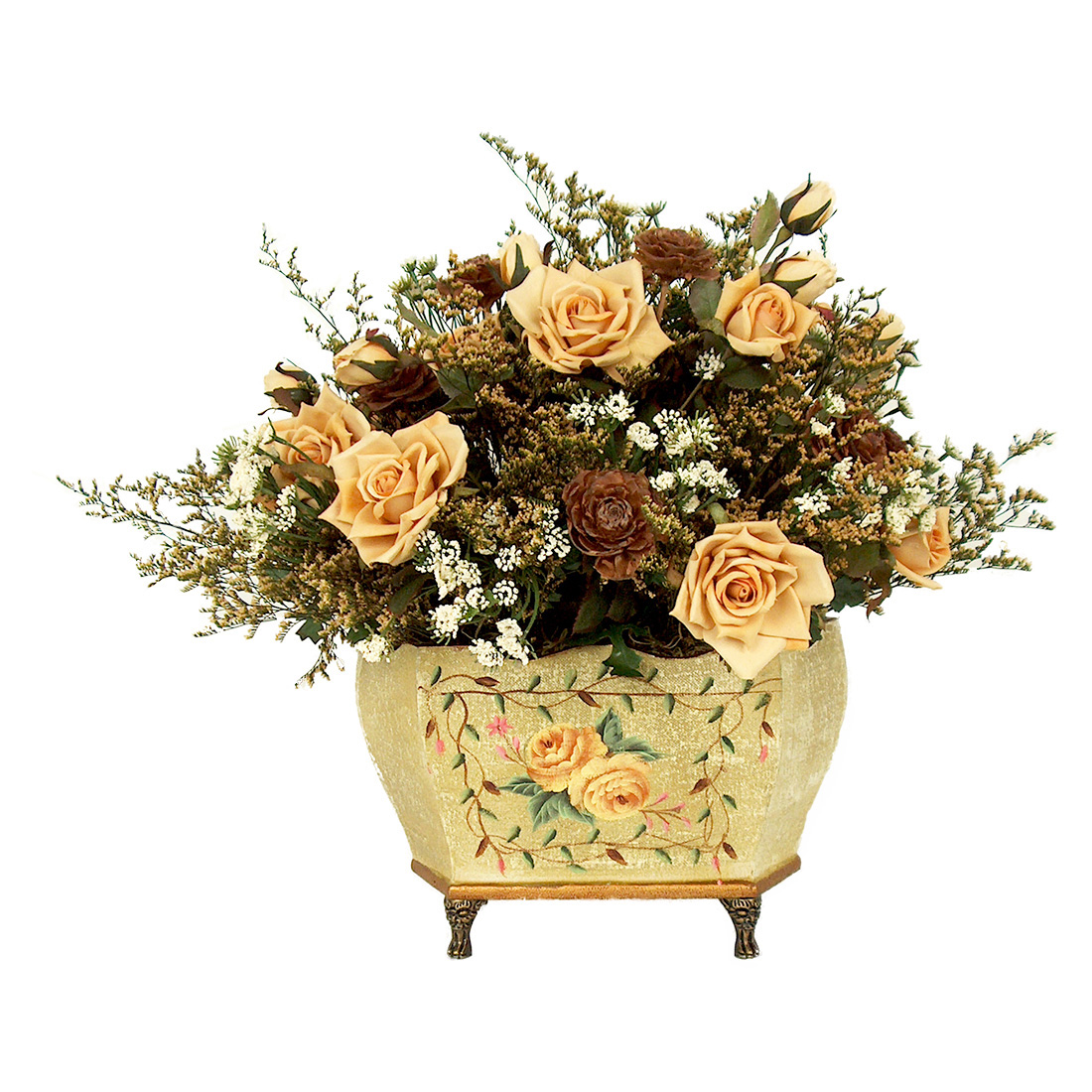 You won't be disappointed if you purchase this sophisticated arrangement to accent your home decor. Following a French country style of decorating this arrangement is made using yellow cream roses, queen Anne's lace, brown wood cedar roses and wild grass in a small oval hand painted planter. We only use the highest quality silk flowers and accents in our custom designs.