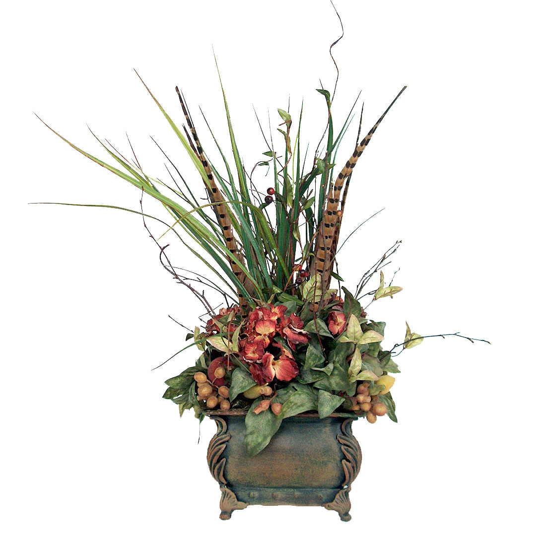 Red hydrangeas, green magnolia leaves, natural birch, multi colored glazed fruit and feathers are arranged in a large Pompeii metal planter. This arrangement has a classic old country feel and will look perfect in an Italian style home.
