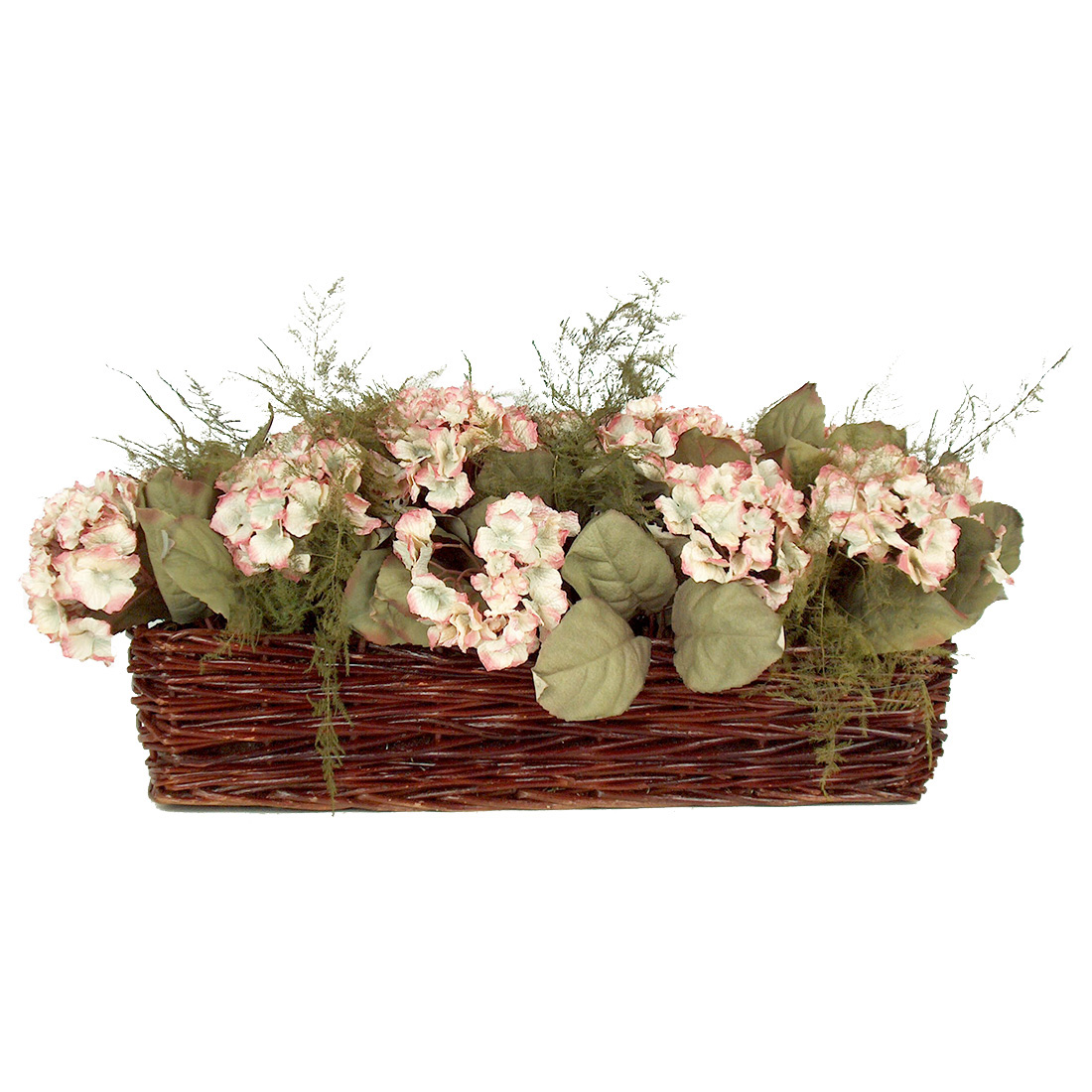 Hydrangeas and dried plumosus are arranged in a stained willow basket in this casual country arrangement. Add a burst of springtime colors to your country kitchen or to the side board in your dining room with this light and playful arrangement.
