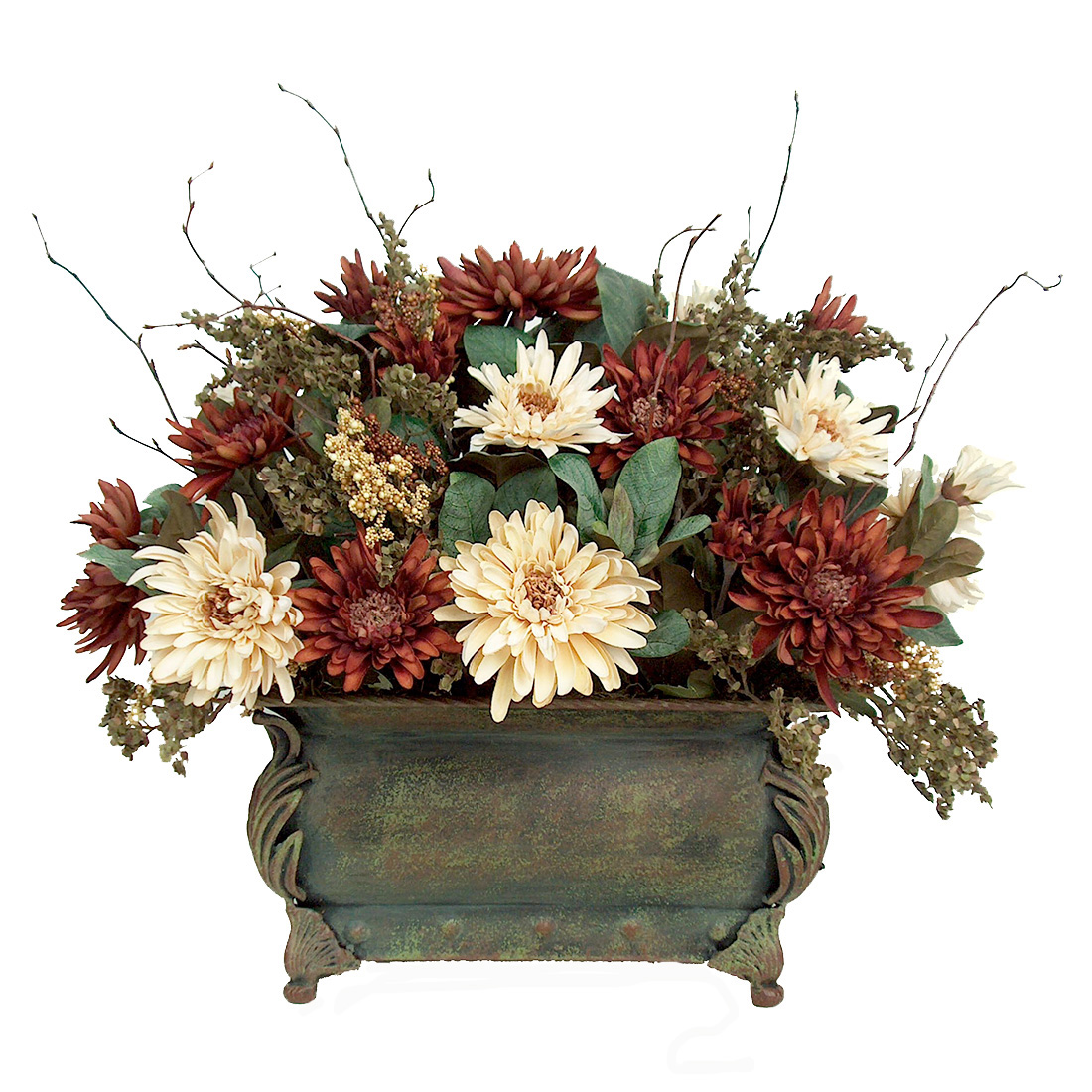 With an eye to the old country this arrangement starts with a stately metal Pompeii planter. Our designer fills out the planter using brick and cream colored mums and boxwood berries and accents them with natural birch. This piece is designed to be a traditional statement for your decor.