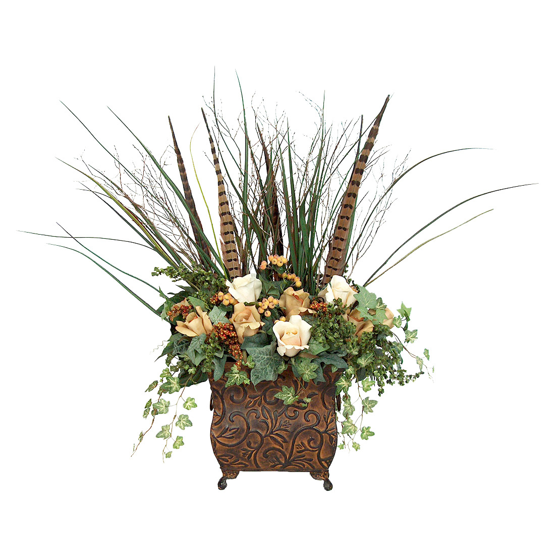 Cream and brown rose buds, ivy, natural birch, berries and feathers arranged in a footed rajah planter. This artful arrangement is crafted to be an accent piece in your living room or library.