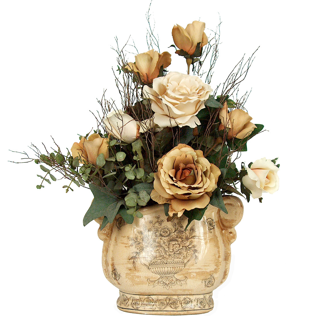 Enjoy the colors of fall with this traditional arrangement. It has been designed using amber and cream roses with natural birch and ivy accents and arranged in a beautiful porcelain vase. This is a perfect accent piece for your every day decor.