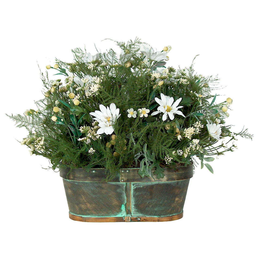 Summer silk flower arrangements are perfect for rooms that don't get a lot of light and you want to add a splash of color to brighten up the room. This gorgeous arrangement is crafted using daisies, berry bush and dried plumosus in a small green splitwood planter. We only use the highest quality silk florals in all of our arrangements.